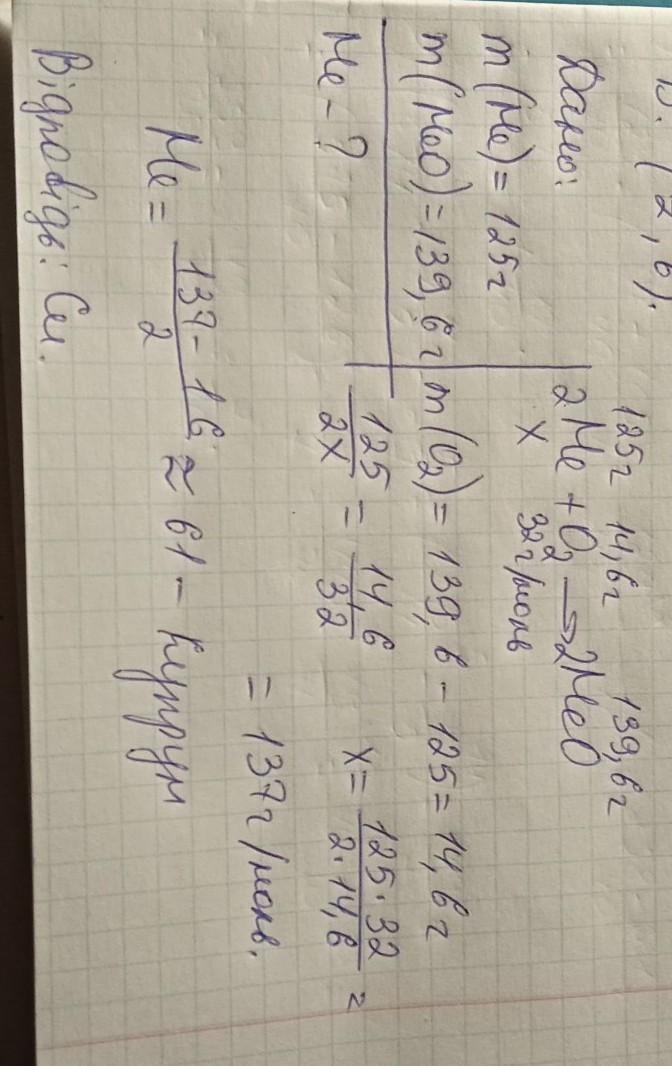 При взаємодії двовалентного металу масою 125 г з киснем одержали оксид масою 139, 6 г. Визначте метал