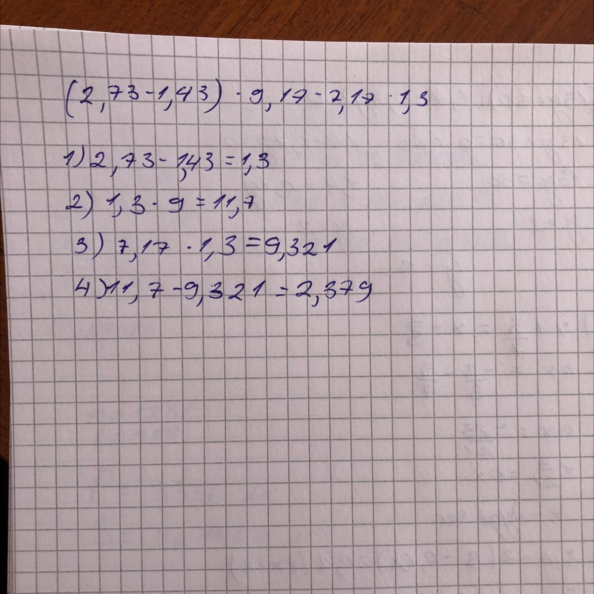 (2,73 - 1,43) * 9,17 - 7,17 * 1,3=(1,3 )* 9,17 - 7,17 * 1,3=11,921- 7,17 * 1,3=4,751*1,3= 6,1763