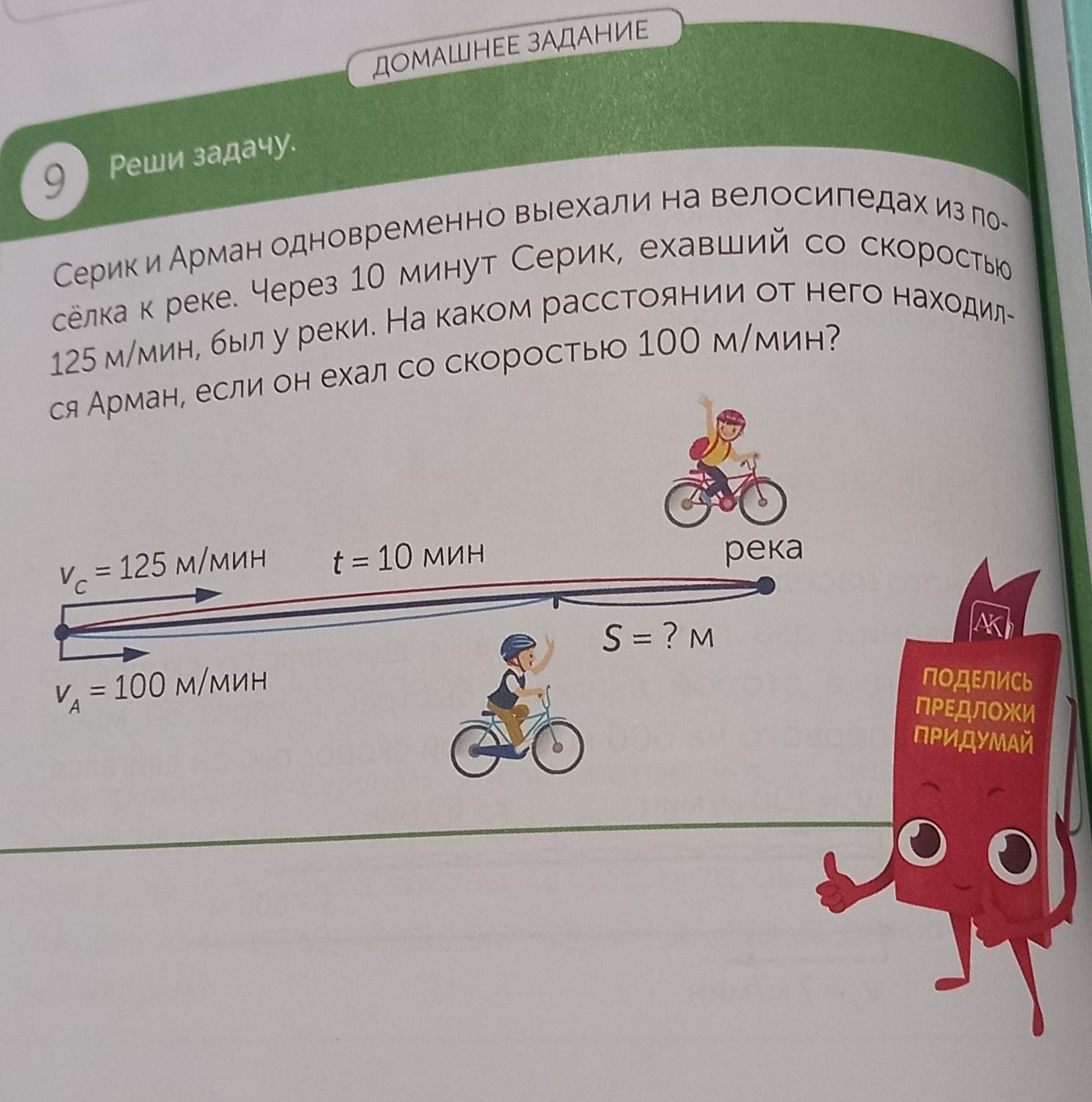 Серик и Арман одновременно выехали на велосипедах из посёлка к реке. Через 10 мин. Серик ехавший со скоростью 125 км/мин, был у реки. На коком растоянии находился Арман, если он ехал со скоростью 100м/мин