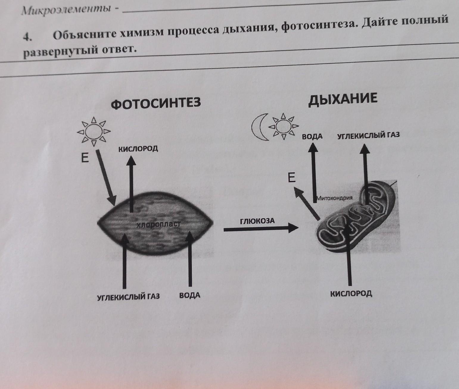 4. Объясните химизм процесса дыхания, фотосинтеза. Дайте полный развернутый ответ. ФОТОСИНТЕЗ ДЫХАНИЕ КИСЛОРОД ВОДА УГЛЕКИСЛЫЙ ГАЗ E E Митохондрия слоропласт ГЛЮКОЗА s УГЛЕКИСЛЫЙ ГАЗ ВОДА КИСЛОРОД