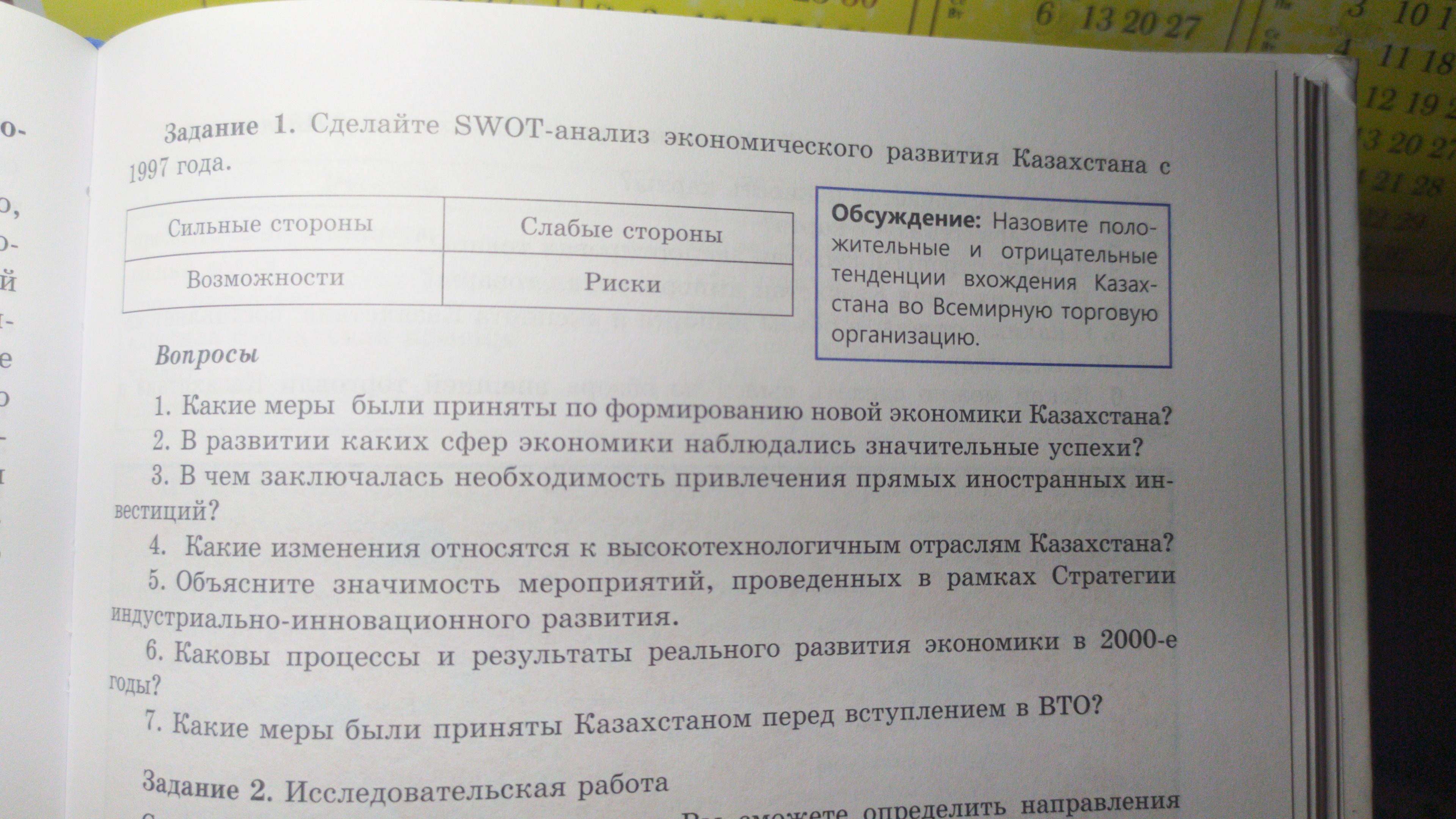 Помогите пожалуйста, история Казахстана, Задание 1. Сделайте SWOT-анализ экономического развития Казахстана с 1997 года.