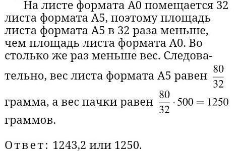 Бумагу формата А5 упаковали в пачки по 500 листов Найдите массу пачки если масса бумаги площади 1 КВ м равна 80г