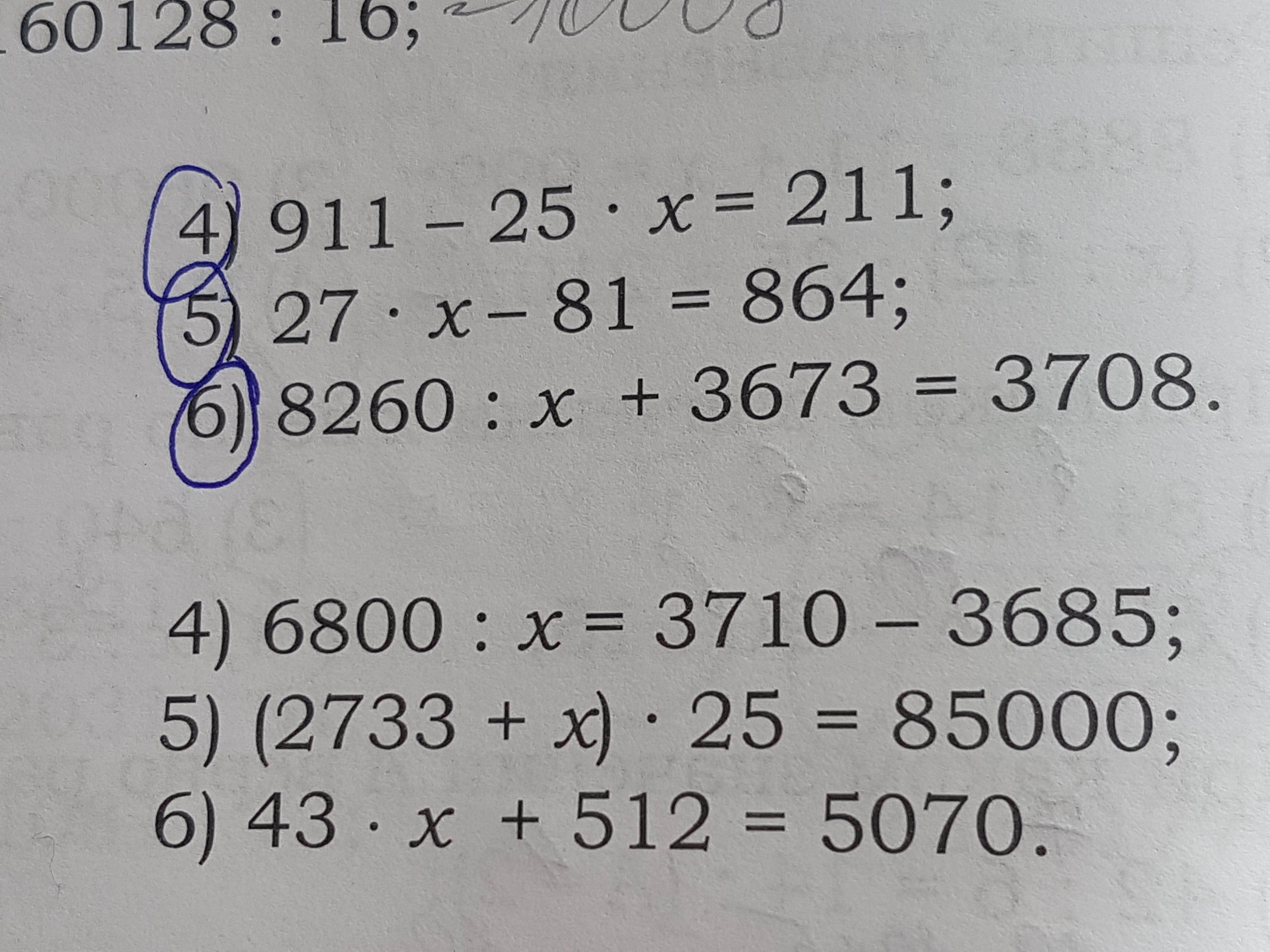 4) 25*х=911-211 5) 27*х=864+81 6) 8260/х=3708-3673