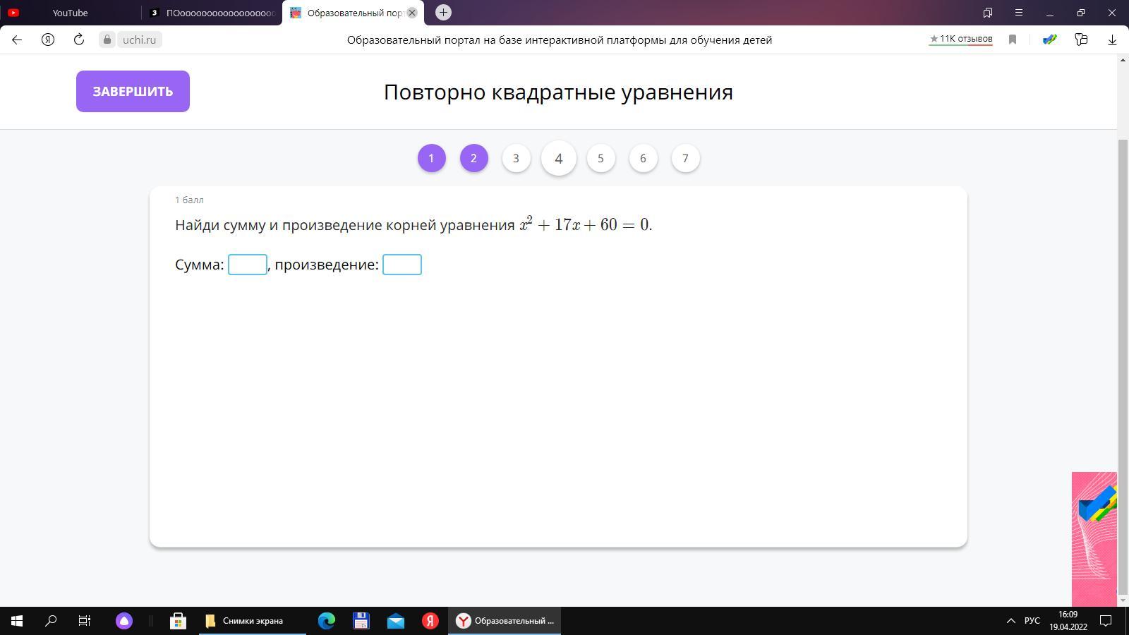 Подставляем значения a=1 b=17 и c=60 в формулу корней квадратного уравнения и решаем относительно xx.