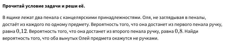 1. Вероятность что в 1 пенале вытянутый предмет окажется не ручкой 1 - 0,12 = 0,88