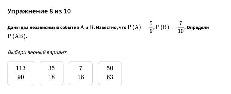 2. P(AB) = 5/9 * 7/10 = 35/90 = 7/18