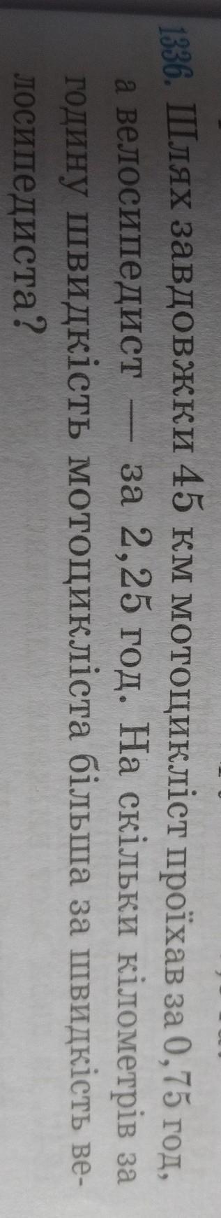 1336. Шлях завдовжки 45 км мотоцикліст проїхав за 0,75 год, а велосипедист за 2,25 год. На скільки кілометрів за годину швидкість мотоцикліста більша за швидкість велосипедиста?