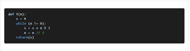 В функции цикл с предусловием выполняется пока переданный параметр (2017) не равен 0 (n != 0), функция суммирует остатки полученные при целочисленном деление этого числа на 2 (s = s + n % 2), а затем выполняет и само целочисленное деление этого числа на 2 (n = n // 2)