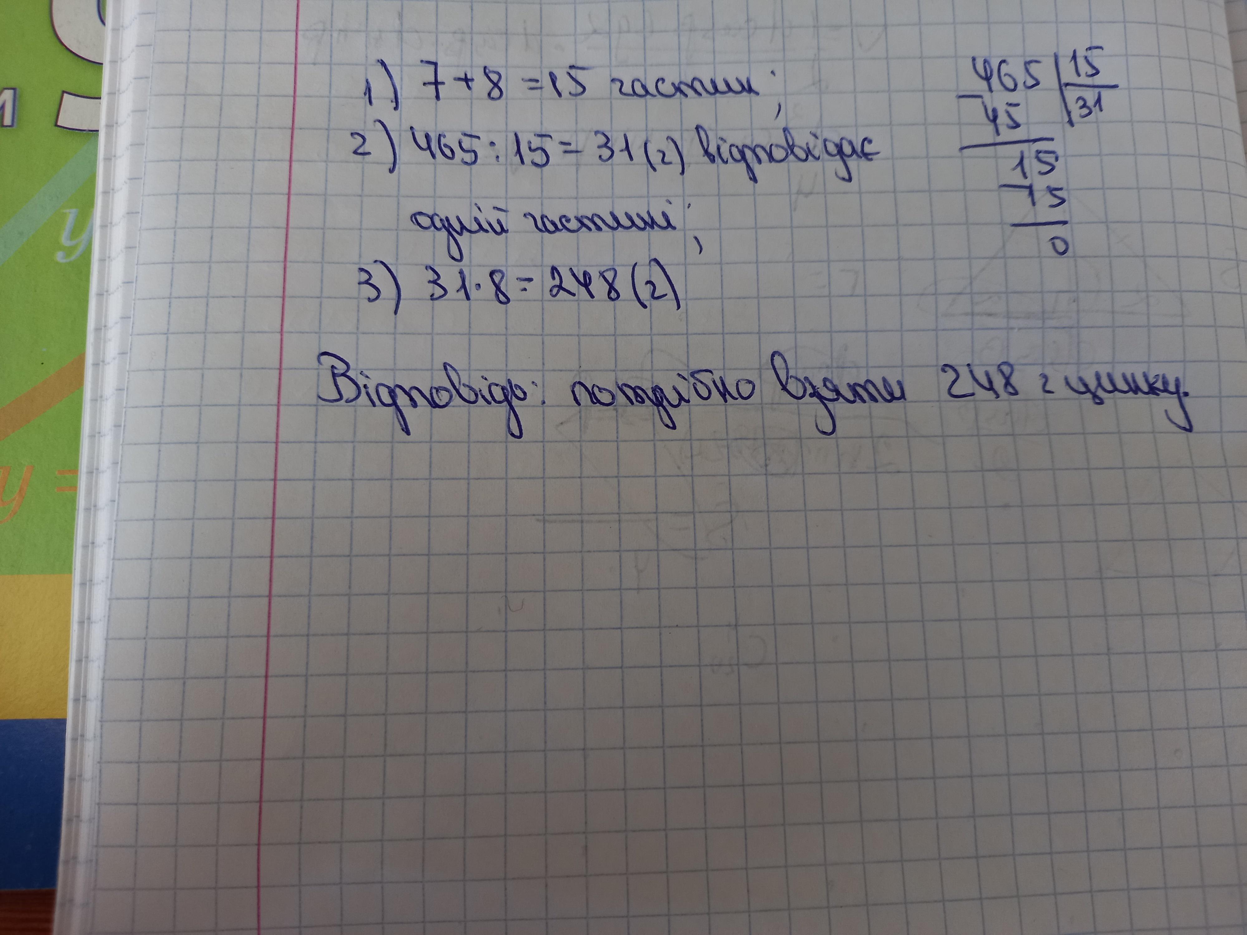 Сплав складається з 7 частин міді та 8 частин цинку. Скільки потрібно взяти кілограмів цинку, щоб одержати 465 кг сплаву?