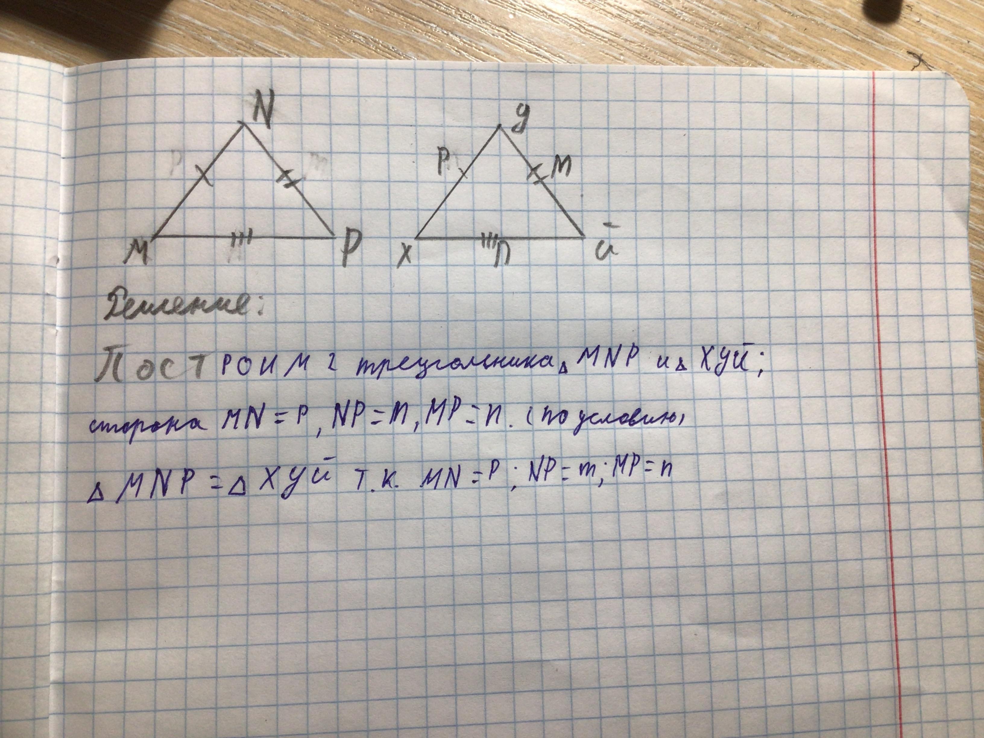дано сторони трикутника m, n, p. побудувати трикутник MNP щоб MN = p, MP = n, NP = m. описати етап побудови і доведення