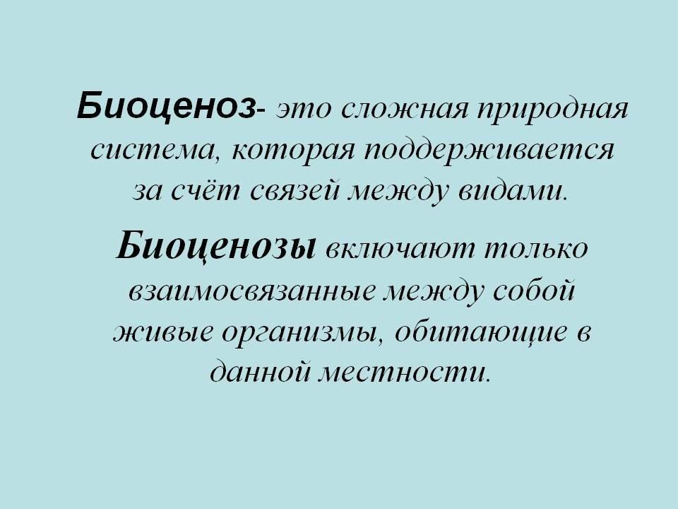 Биоценоз — это исторически сложившаяся совокупность животных, растений, грибов и микроорганизмов, населяющих относительно однородное жизненное пространство (определённый участок суши или акватории), связанных между собой, а также окружающей их средой.