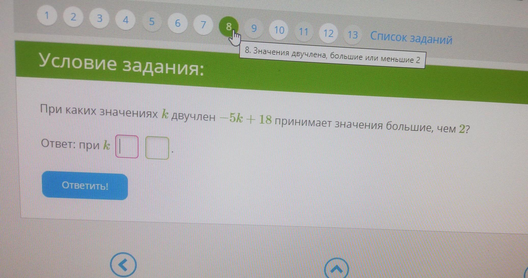 При к<3,2 двучлен -5к+18 принимает значения большие, чем 2.