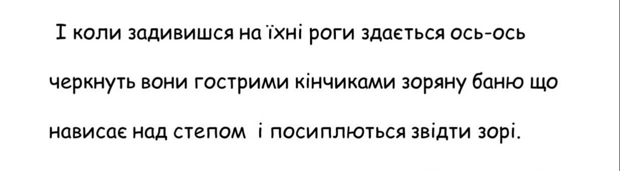 І коли задивишся на їхні роги, здається: ось-ось черкнуть вони гострими кінчиками зоряну баню, що нависає над степом, і послються звідти зорі.