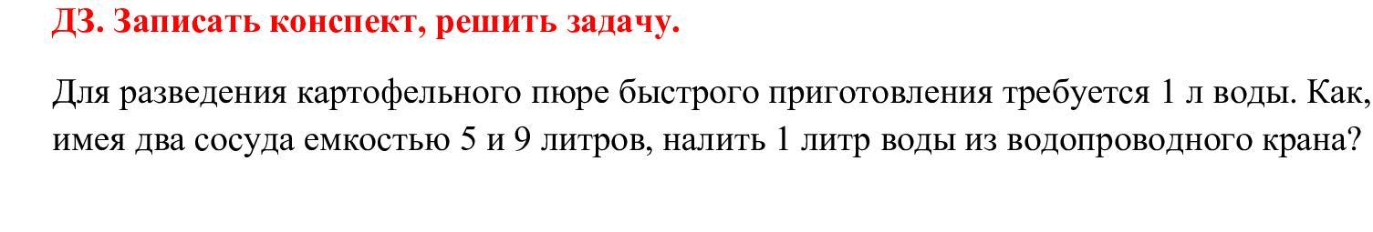 2) выливаем воду из сосуда ёмкостью 5 литров в сосуд ёмкостью 9 литров (сосуд ёмкостью 5 литров пустой, в сосуде ёмкостью 9 литров находится 5 литров воды)