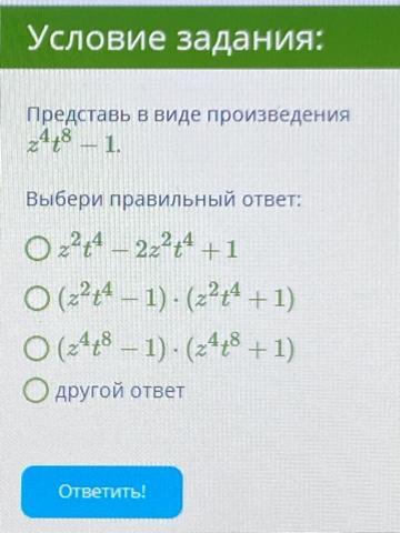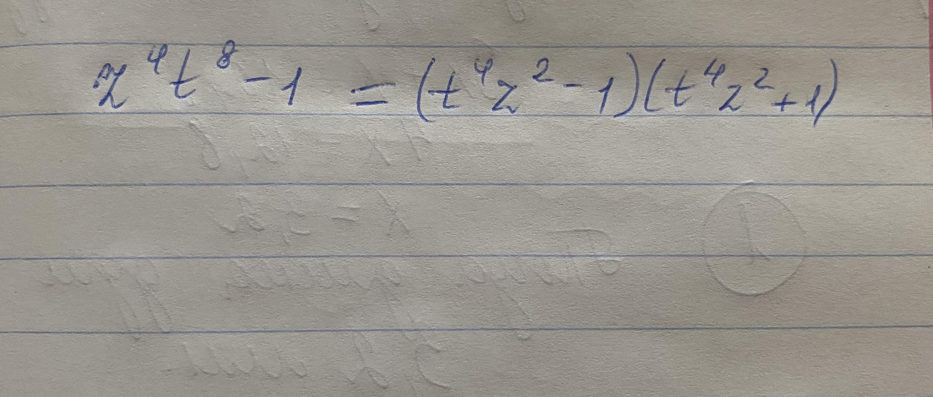 Тогда z^4*t^8 - 1 = (z^2*t^4)^2 - 1^2 = = (z^2*t^4 - 1)(z^2*t^4 + 1)