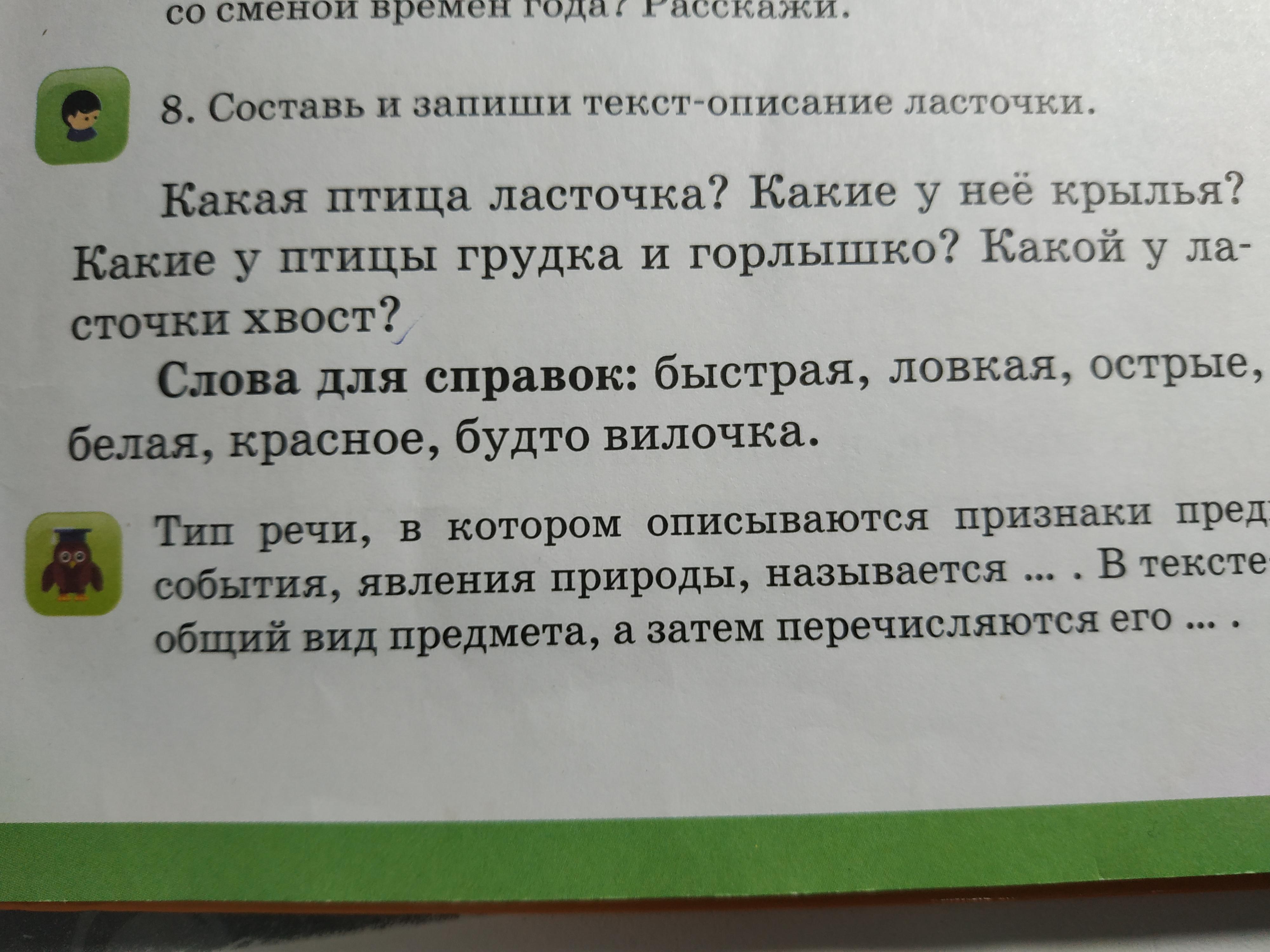 Ласточка очень быстрая. Своими острыми крыльями она прорезает облака, красивая белая грудка, красная шея и хвостик, будто вилочка. Мне очень нравиться эта птица.