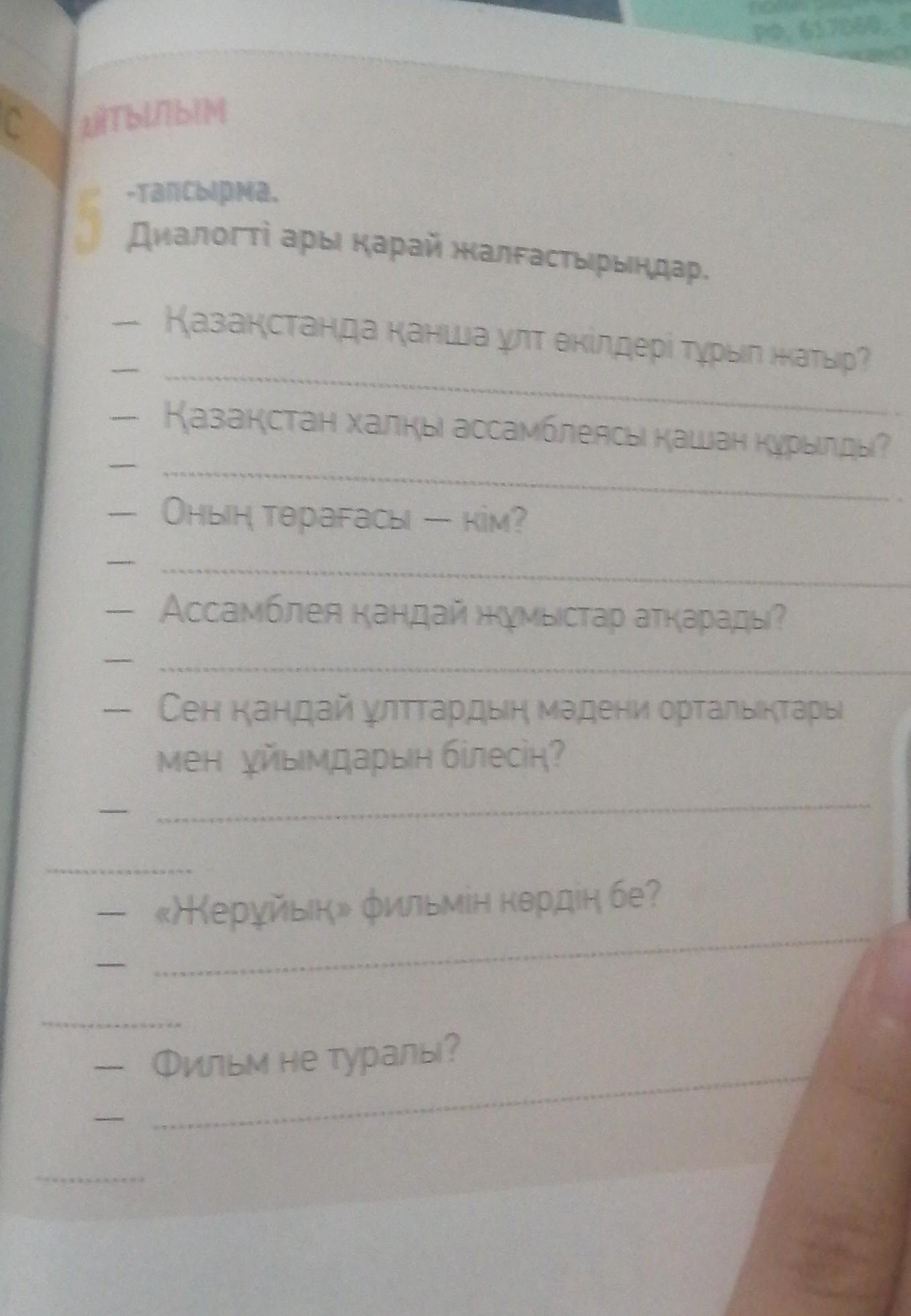 қазақстан халық ассамблеясы 1995 жылы 1 наурызда құрылды3)Н.Ә.Назарбаев қазақстан ассамблеясының төрағасы (не точный инфа) 4)Ассамблея белгілі бір мәселелерді талқылау ісің атқару5)республикалық, областық аудандық ұйымдарды білемің 6)Иә,мен жерұйық фильмің көрдім 7)Қазақстанның басқа жердең көшіп келуі