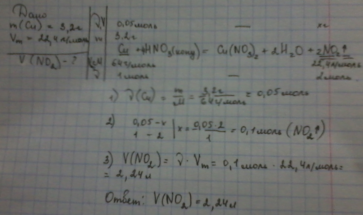 При взаимодействии 3.2 г меди с концентрированной азотной кислоты,выделился бурый газ .Рассчитайте его объем (н.у) предварительно составив уравнение реакции.
