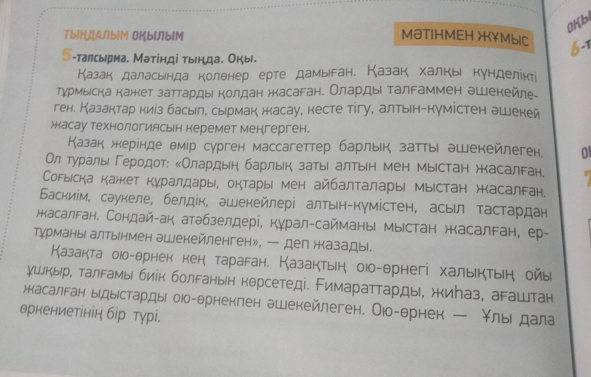 Қазақ даласында қолөнер ерте дамыған. Қазақ халқы күнделікті тұрмысқа қажет заттарды қолдан жасаған. Оларды талғаммен әшекейле ген. Қазақтар киіз басып, сырмақ жасау, кесте тігу, алтын-күмістен әшекей насау технологиясын керемет меңгерген Қазақ жерінде өмір сүрген массагеттер барлық затты әшекейлеген Ол туралы Геродот: «Олардың барлық заты алтын мен мыстан жасалған Соғысқа қажет құралдары, оқтары мен айбалталары мыстан жасалған Баскиім, сәукеле, белдік, әшекейлері алтын-күмістен, асыл тастардан жасалған. Сондай-ақ атәбзелдері, құрал-сайманы мыстан жасалған, ер- тұрманы алтынмен әшекейленген», - деп жазады. » Қазақта ою-өрнек кең тараған. Қазақтың ою-өрнегі халықтың ойы ұшқыр, талғамы биік болғанын көрсетеді. Ғимараттарды, жиһаз, ағаштан жасалған ыдыстарды ою-өрнекпен әшекейлеген. Ою-өрнек ернениетінің бір түрі. Ұлы дала