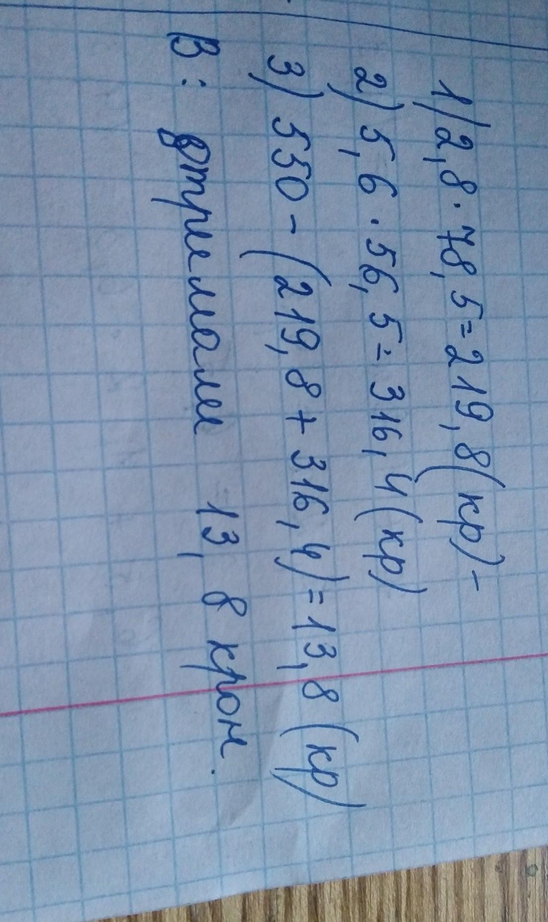 Мари Мару, жена учителя Юри Мару, купила в магазине 2.8 м ткани по центре 78.5 кр. за метр, и 5.6 м такни по центре 56.5 кр. за метр. Сколь сдачи она получила с 550 крон?