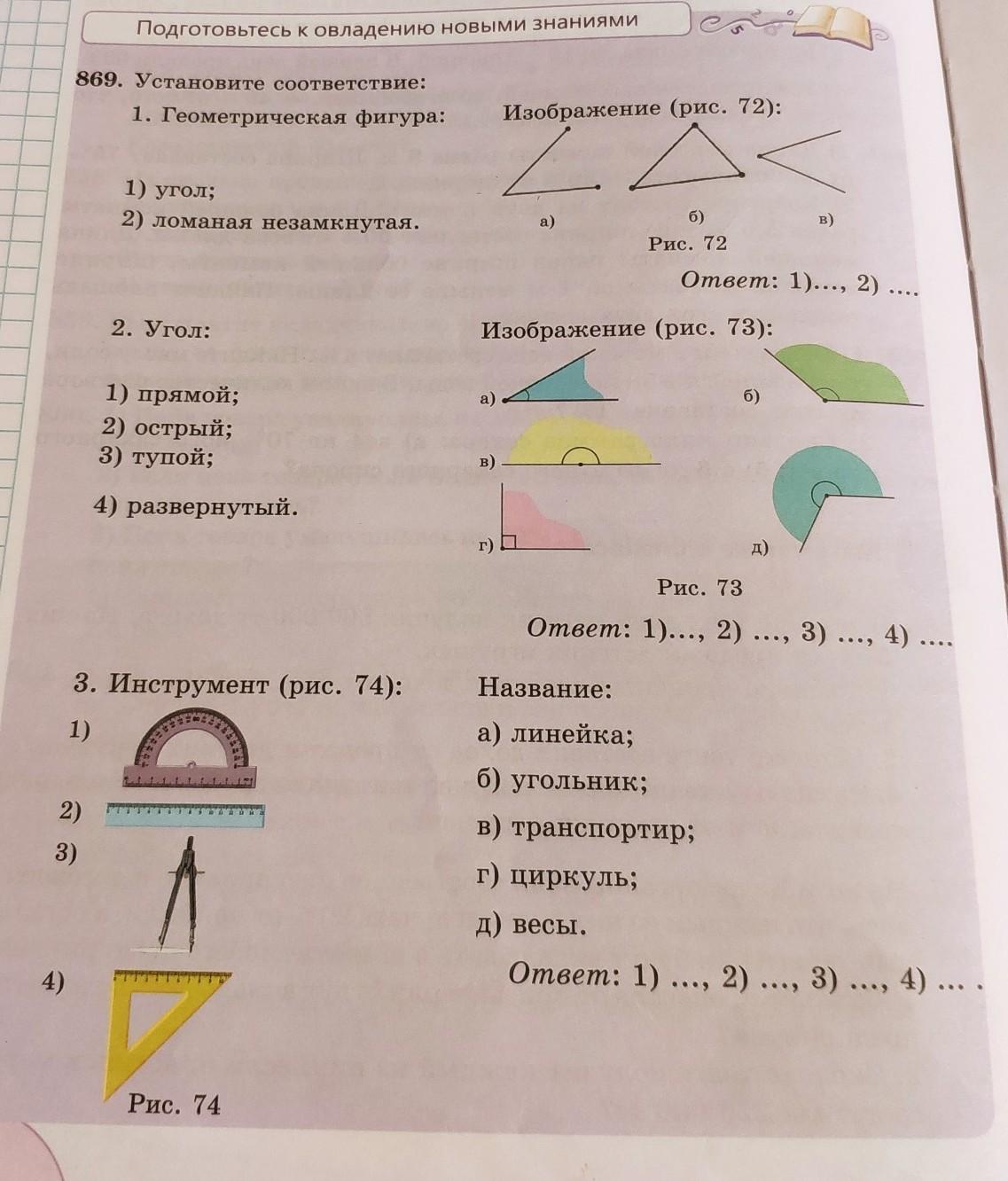 Подготовьтесь к овладению новыми знаниями 869. Установите соответствие: 1. Геометрическая фигура: Изображение (рис. 72): 1) угол; 2) ломаная незамкнутая. 6) Рис. 72 Ответ: 1)..., 2) .... Изображение (рис. 73): 2. Уrол: 6) a) 1) прямой; 2) острый; 3) тупой; в) 4) развернутый. д) Рис. 73 Ответ: 1)..., 2) ..., 3) ..., 4) .... 3. Инструмент (рис. 74): Название: 1) 2) 3) = а) линейка; б) угольник; в) транспортир; г) циркуль; д) весы. Ответ: 1) ..., 2) ..., 3) ..., 4) ... . 4) Рис. 74