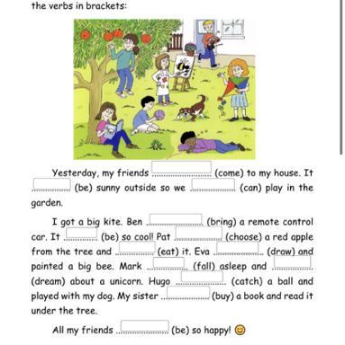 I got a big kite. Ben brought a remote control car. It was so cool! Pat chose a red apple from the tree and ate it. Ewa drew and painted a big bee. Mark fell asleep and dreamt about a unicorn. Hugo caught a ball and played with my dog. My sister bought a book and read it under the tree.
