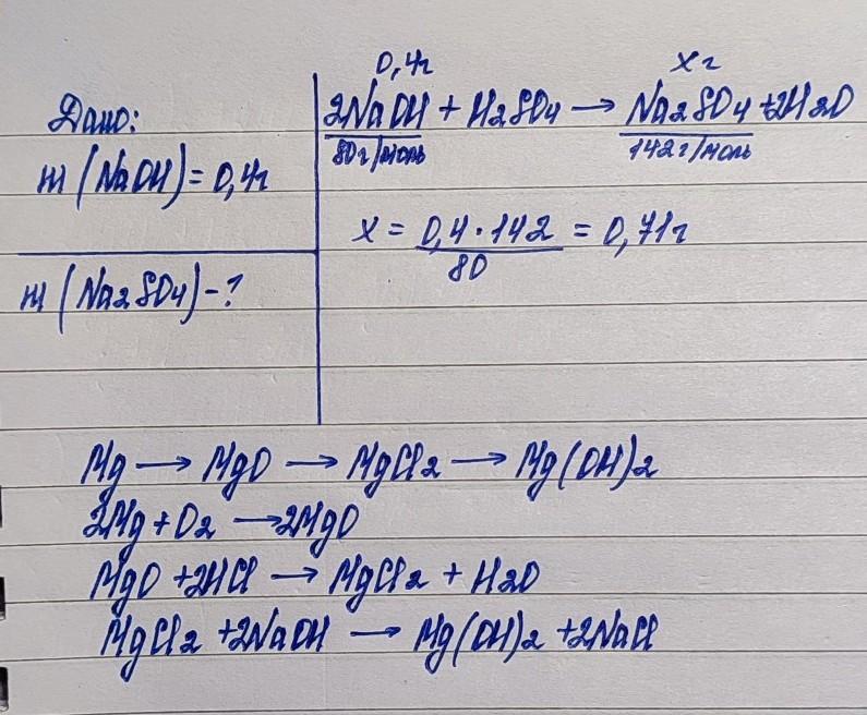2. Определить массу сульфата натрия образовавшегося при взаимодействии серной кислоты с гидроксидом натрия массой 0,4 г.