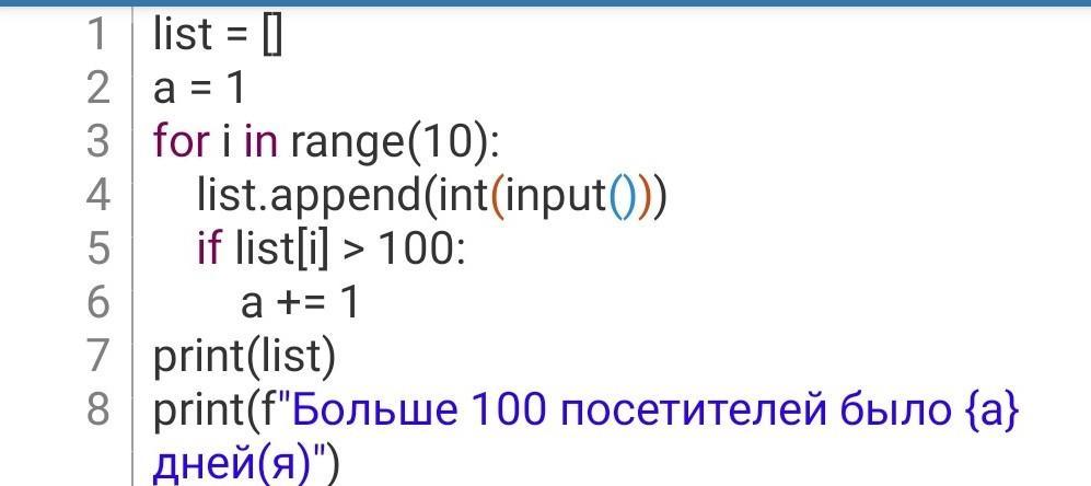 Питон | Создайте проект, в котором вводится количество посетителей музея в каждый из 10 дней и определяется, сколько дней количество посетителей превышало 100 человек. Используйте одномерный массив (список)