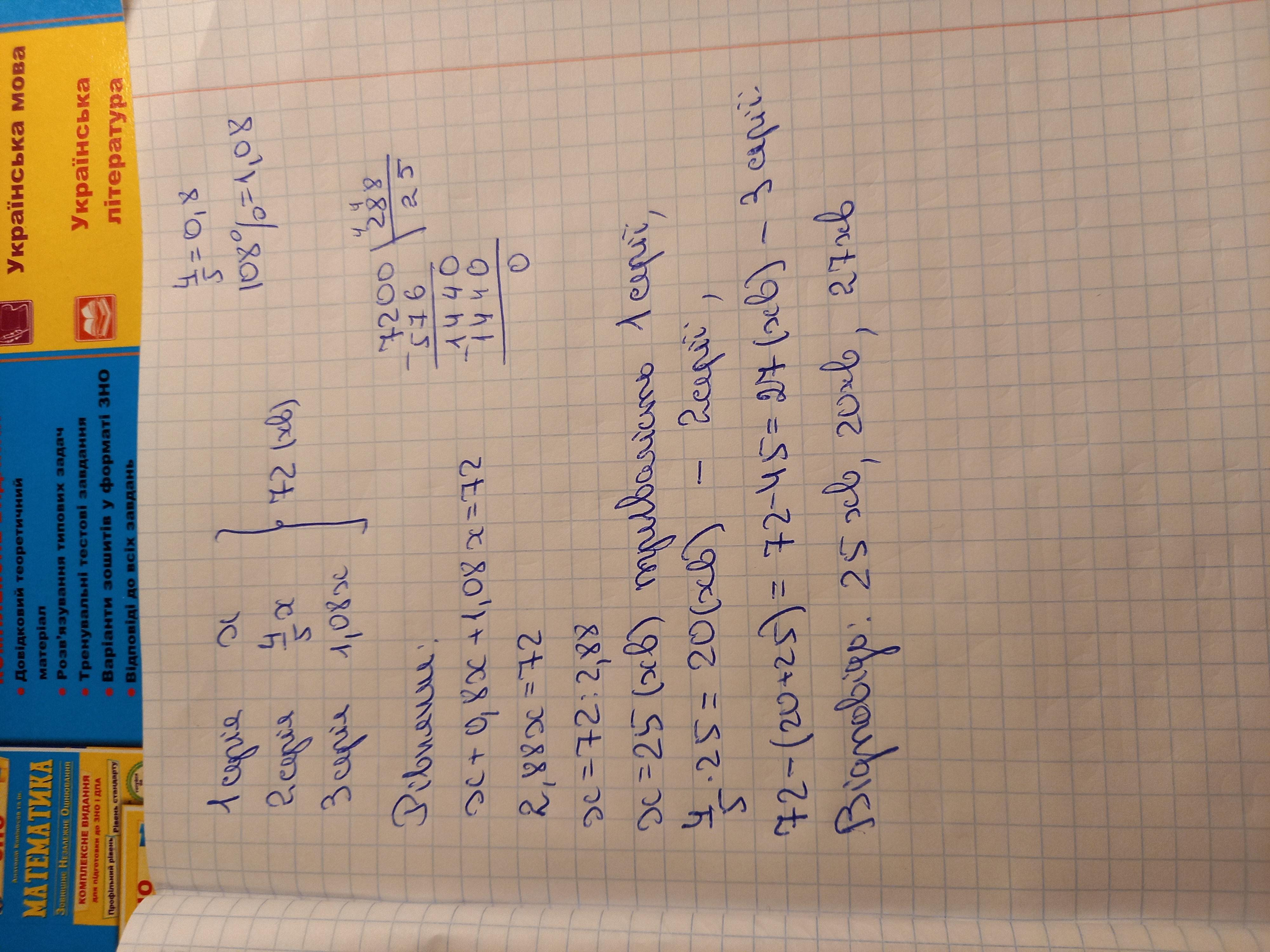 Три серії фільму тривають 72 хв, причому тривалість другої серії становить 45 тривалості першої, а тривалість третьої - 108% тривалості першої. Знайдіть тривалість кожної серії.