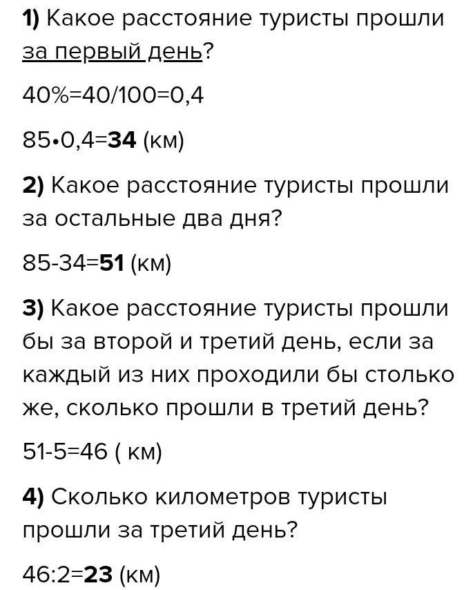 Туристи за три дні пройшли 85 км . За перший день вони пройшли 40% усієї відстані , а за другий день на 5 км більше , ніж за третій день . Скільки кілометрів пройшли туристи за третій день?