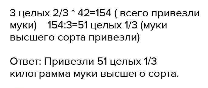 На хлебозавод завезли 42 машины муки. При этом 3⅔ т в каждой машине содержится ⅓ муки высшего сорта, остальные первого, сколько завезли муки первого сорта? Помогите пж!кратко запись здачи