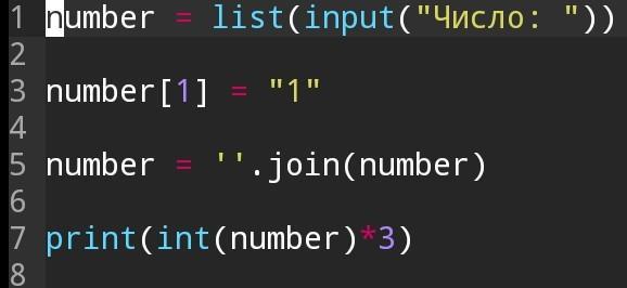 С клавиатуры вводится трехзначное число. Заменить в нем среднюю цифру на единицу и ре- зультат умножить на три.phyton