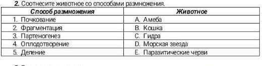 2. Соотнесите животное со способами размножения, Способ размножения Животное 1. Почкование A Амеба 2 Фрагментация В Кашка 3. Партеногенез с. Гидра 4 Оплодотворение D. Морская звезда 5 Деление E. Паразитические черви