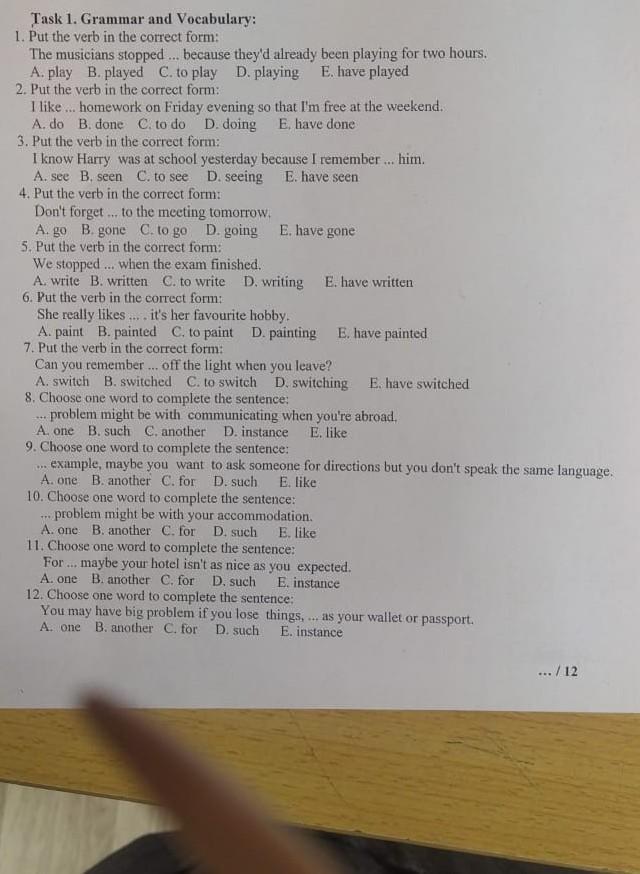 Task 1. Grammar and Vocabulary : 1. Put the verb in the correct form : The musicians stopped ... because they'd already been playing for two hours . D. playing A. play B. played C. to play D. playing E. have played Put the verb in the correct form : I like ... homework on Friday evening so that I'm free at the weekend . A. do B. done C. to do D. doing E. have done 3. Put the verb in the correct form : I know Harry was at school yesterday because I remember ... him . A. see B. seen C. to see D. seeing E. have seen 4. Put the verb in the correct form : Don't forget ... , to the meeting tomorrow . A. go B. gone C. to go D. going E. have gone 5. Put the verb in the correct form : We stopped ... when the exam finished . A. write B. written C. to write D. writing E. have written 6. Put the verb in the correct form : She really likes .... it's her favourite hobby , A. paint B. painted C. to paint D. painting E. have painted 7. Put the verb in the correct form : Can you remember ... off the light when you leave ? A. switch B. switched C. to switch D. switching E. have switched 8. Choose one word to complete sentence S problem might be with communicating when you're abroad . THAT A. one B. such C. another D. instance E. like 9. Choose one word to complete the sentence : 100 example , maybe you want to ask someone for directions but you don't speak the same language . A. one B. another C. for D. such E. like 10. Choose one word to complete the sentence : HE problem might be with your accommodation . A. one B. another C. for D. such E. like 11. Choose one word to complete the sentence : For ... maybe your hotel isn't as nice as you expected . A. one B. another C. for D. such E. instance 12. Choose one word to complete the sentence : You may have big problem if you lose things , ... as your wallet or passport . A. one B. another C. for D. such E. instance
