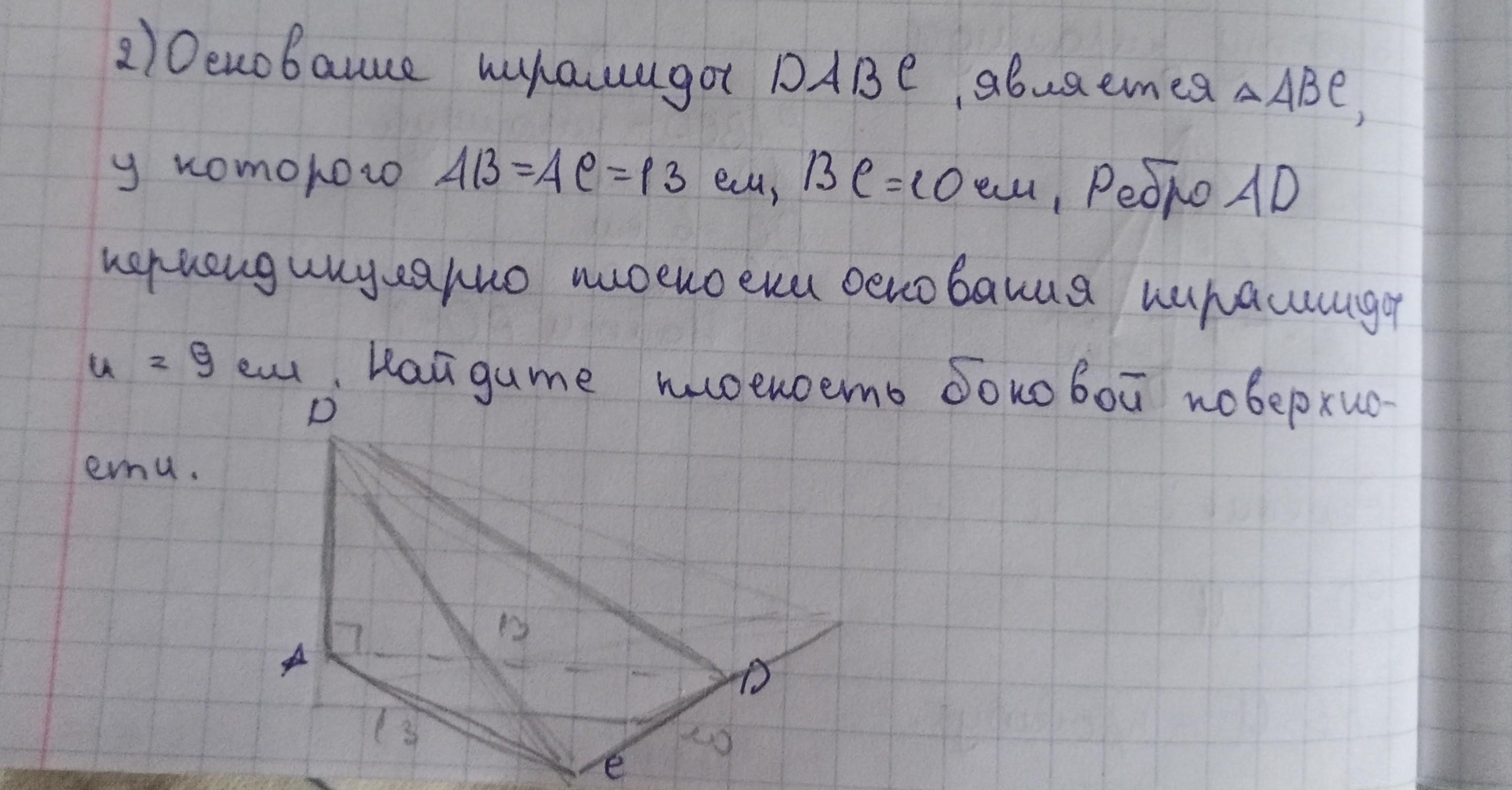АВСД - пирамида, АД⊥АВС , АВ=АС=13 см , ВС=10 см , АД=9 см .