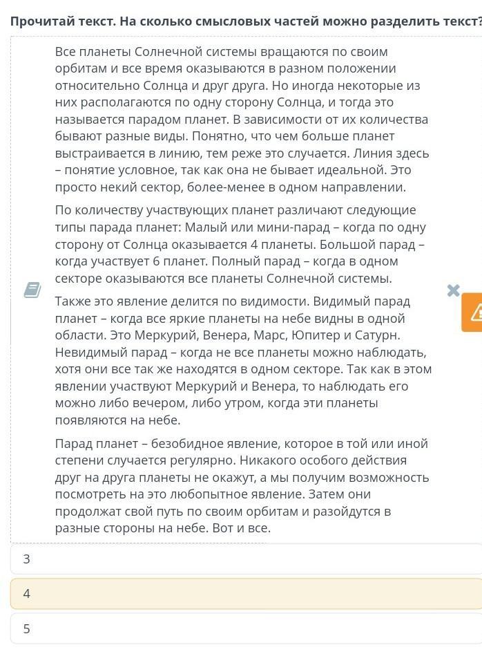 Прочитай текст. На сколько смысловых частей можно разделить текст? Все планеты Солнечной системы вращаются по своим орбитам и все время оказываются в разном положении относительно Солнца и друг друга. Но иногда некоторые из них располагаются по одну сторону Солнца, и тогда это называется парадом планет. В зависимости от их количества бывают разные виды. Понятно, что чем больше планет выстраивается в линию, тем реже это случается. Линия здесь — понятие условное, так как она не бывает идеальной. Это просто некий сектор, более-менее в одном направлении. По количеству участвующих планет различают следующие типы парада планет: Малый или мини-парад – когда по одну сторону от Солнца оказывается 4 планеты. Большой парад - когда участвует 6 планет. Полный парад – когда в одном секторе оказываются все планеты Солнечной системы. Также это явление делится по видимости. Видимый парад планет – когда все яркие планеты на небе видны в одной области. Это Меркурий, Венера, Марс, Юпитер и Сатурн. Невидимый парад – когда не все планеты можно наблюдать, хотя они все так же находятся в одном секторе. Так как в этом явлении участвуют Меркурий и Венера, то наблюдать его можно либо вечером, либо утром, когда эти планеты появляются на небе. Парад планет – безобидное явление, которое в той или иной степени случается регулярно. Никакого особого действия друг на друга планеты не окажут, а мы получим возможность посмотреть на это любопытное явление. Затем они продолжат свой путь по своим орбитам и разойдутся в разные стороны на небе. Вот и все. 3 4 5