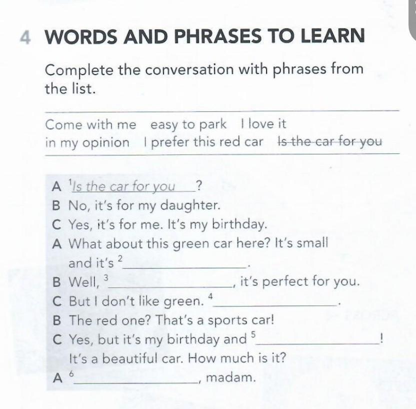 4 WORDS AND PHRASES TO LEARN Complete the conversation with phrases from the list. Come with me easy to park Ilove it in my opinion I prefer this red car Is the car for you A 'Is the car for you? B No, it's for my daughter. C Yes, it's for me. It's my birthday. A What about this green car here? It's small and it's 2 B Well, 3 C But I don't like green. B The red one? That's a sports car! C Yes, but it's my birthday and 5 …, it's perfect for you. It's a beautiful car. How much is it? A 6 , madam. пжпжпжпж срочно