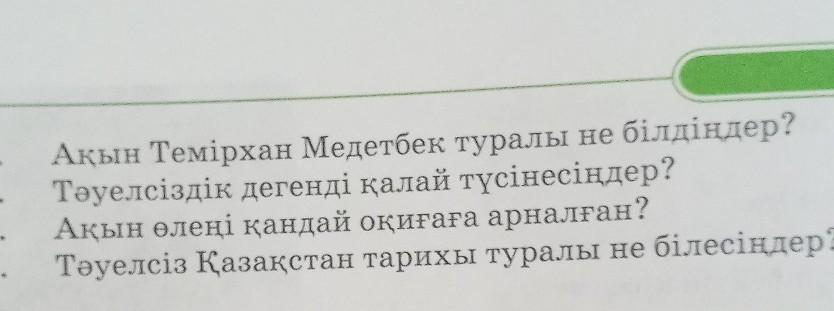 1.Ақын Темірхан Медетбек ол кісі жазушы, мемлекет сыйлықтың иегері, қоғам қайраткері