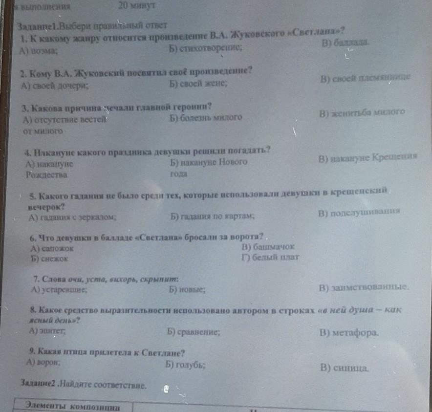 Задание 1.Выбери правильный ответ 1. К каков жанру относится проведение В.А. Жуковского «Светлана»? A) Itорма: Б) стихотворение; в) булаа 2. Kory В.А. Жуковский посвятил свое произведение? А) своей дочери; Б) своей жене; в) своей племінде В) женитьба лого 3. Какова причина печали главной героини? А) отсутствие вестей Б) болезнь много от милого 4. Накануне какого праздника девушки решили погадать? A) накануне Б) накануне Нового Родества года В) накануне Крещении 5. Какото гарання не было среди тех, которые использовали девушки в крещенскі вечерок? A) rnaa и с зеркалом: Б) rадания по картам; В) поделушивания 6. Что девушки в баллаас «Светлана» бросали за ворота? А) садокок В) башмачок