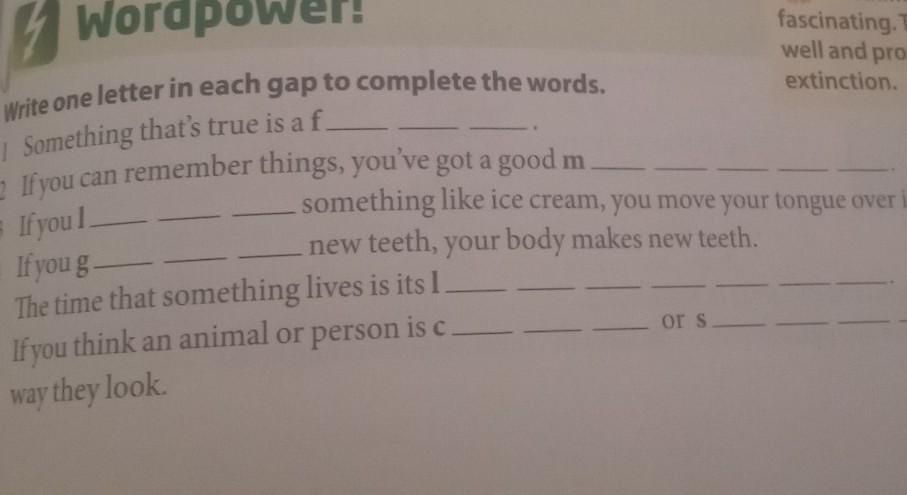 extinction. Write one letter in each gap to complete the words. i Something that's true is af 2 If you can remember things, you've got a good m 3 If you? something like ice cream, you move your tongue over it. If you g new teeth, your body makes new teeth. The time that something lives is its 1 If you think an animal or person is c or s you like the way they look
