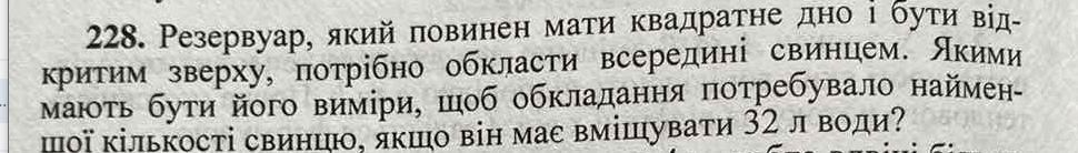 Пусть сторона квадрата дна равна a м, а высота резервуара h м, тогда: