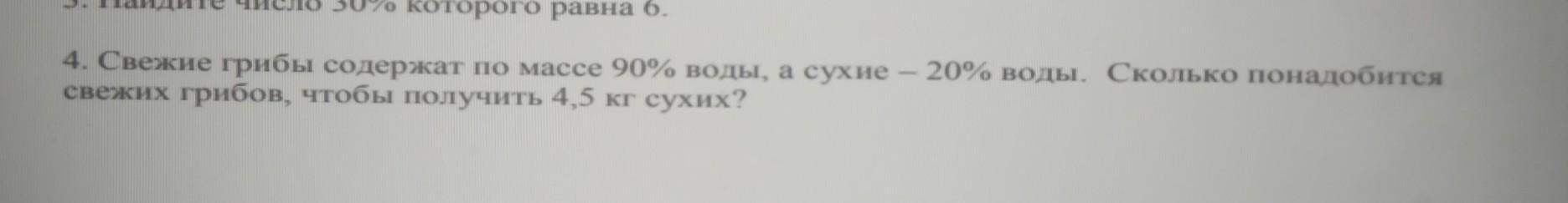 4,5 * 80%=4,5*0,8=3,6(кг) - масса сухого вещества в свежих и сухих грибах(не изменяется).