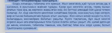 1 балл 2. Сұрақтарға мәтін мазмұны бойынша жауап беріңіз. Сұрақ-Жауап Мәтiн не туралы? Жаз кандай жыл мезгiлi? Көктем қалай суреттелген? Жауап Збалл