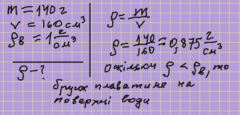 Маса бруска 140г об'єм 160см кубічних. Як буде поводити себе брусок у чистій воді. Густина води 1г/см кубічний. *