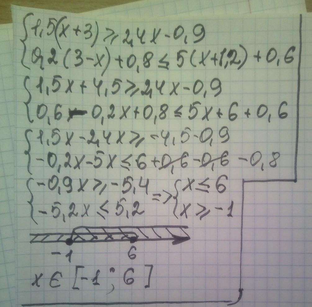 1,5(х+3) больше или равно 2,4х-0,9