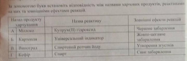 За допомогою букв встановіть відповідність між назвами харчових продуктів, реактиваии на них та зовнішніми ефектами реакці(фотографувала вчителька)