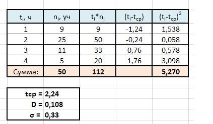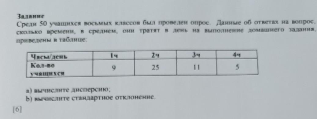 Задание Среди 50 учащихся восьмых классов был проведен опрос. Данные об ответах на вопрос, сколько времени, в среднем, они тратят в день на выполнение домашнего задания, приведены в таблице: 2ч 19 3ч 4ч Часы/день Кол-во учащихся 9 25 11 5 а) вычислите дисперсию; b) вычислите стандартное отклонение. [6]