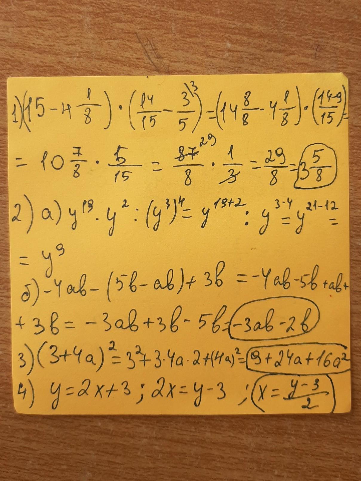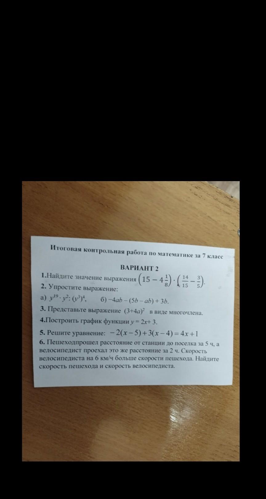 Итоговая контрольная работа по математике за 7 класс ВАРИАНТ 2 1.Найдите значение выражения (15 – 45) - ( - ). 14 3 . 15 5 2. Упростите выражение: а) 19. у : (v), б) -4ab — (5b — ab) + 3b. 3. Представьте выражение (3+4а)? в виде многочлена. 4.Построить график функции y = 2х+ 3. 5. Решите уравнение: - 2(x-5) + 3(х – 4) = 4х + 1 6. Пешеходпрошел расстояние от станции до поселка за 5 ч, а велосипедист проехал это же расстояние за 2 ч. Скорость велосипедиста на 6 км/ч больше скорости пешехода. Найдите скорость пешехода и скорость велосипедиста.