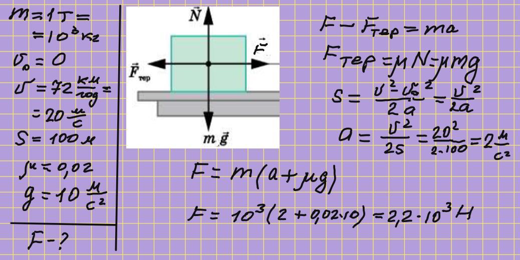 Автомобіль масою 1 т, рушає з місця і розганяється до 72 км/год пройшовши шлях 100м . Визначте силу тяги двигуна, якщо коефіцієнт тертя 0,02.