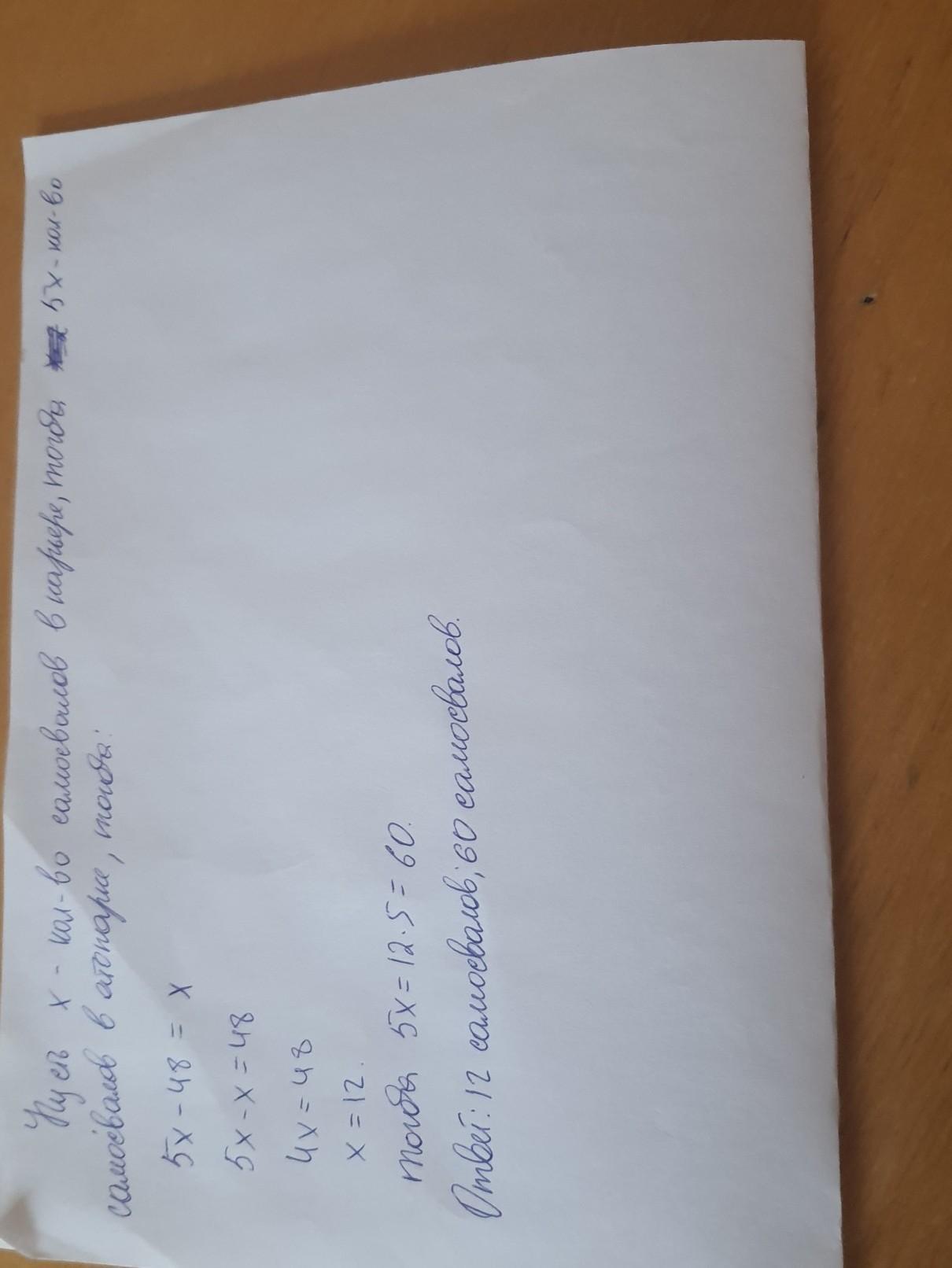 в карьере стояло в 5 раз меньше самосвалов чем в автопарке. Из автопарка к карьеру перегнали 48 самосвалов после этого кол-во машин стало одинаково. Сколько самосвалов было в автопарке и сколько было возле карьера?